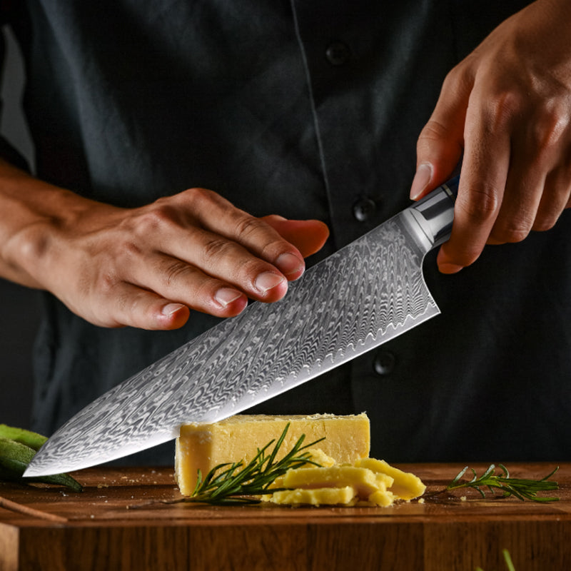 This 8 chef knife is made from real Damascus steel. known for its strength and durability. The utility kitchen knife is perfect for all your food prep needs. from chopping vegetables to slicing meats. Comes with an elegant gift box to make a perfect present for any cooking enthusiast.